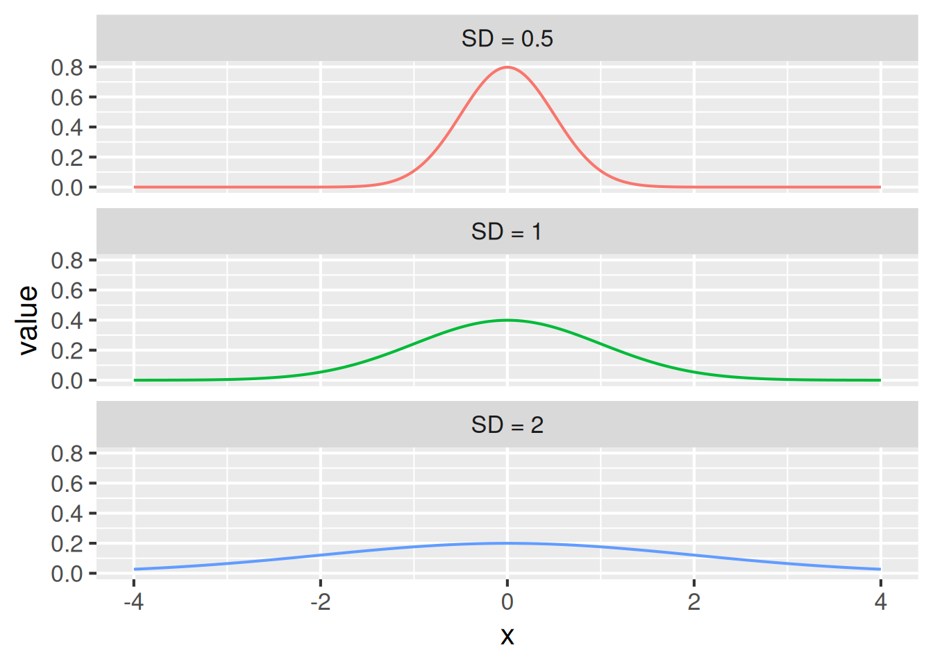 "SD = 0.5" = dnorm(x, sd = 0.5),