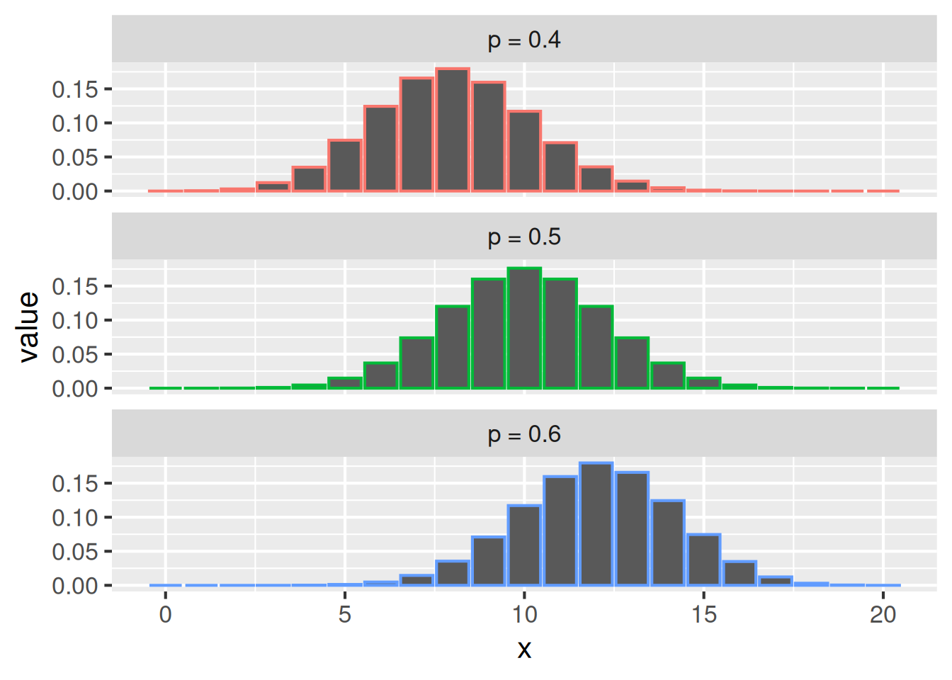 "p = 0.4" = dbinom(x, size = 20, prob = 0.4),