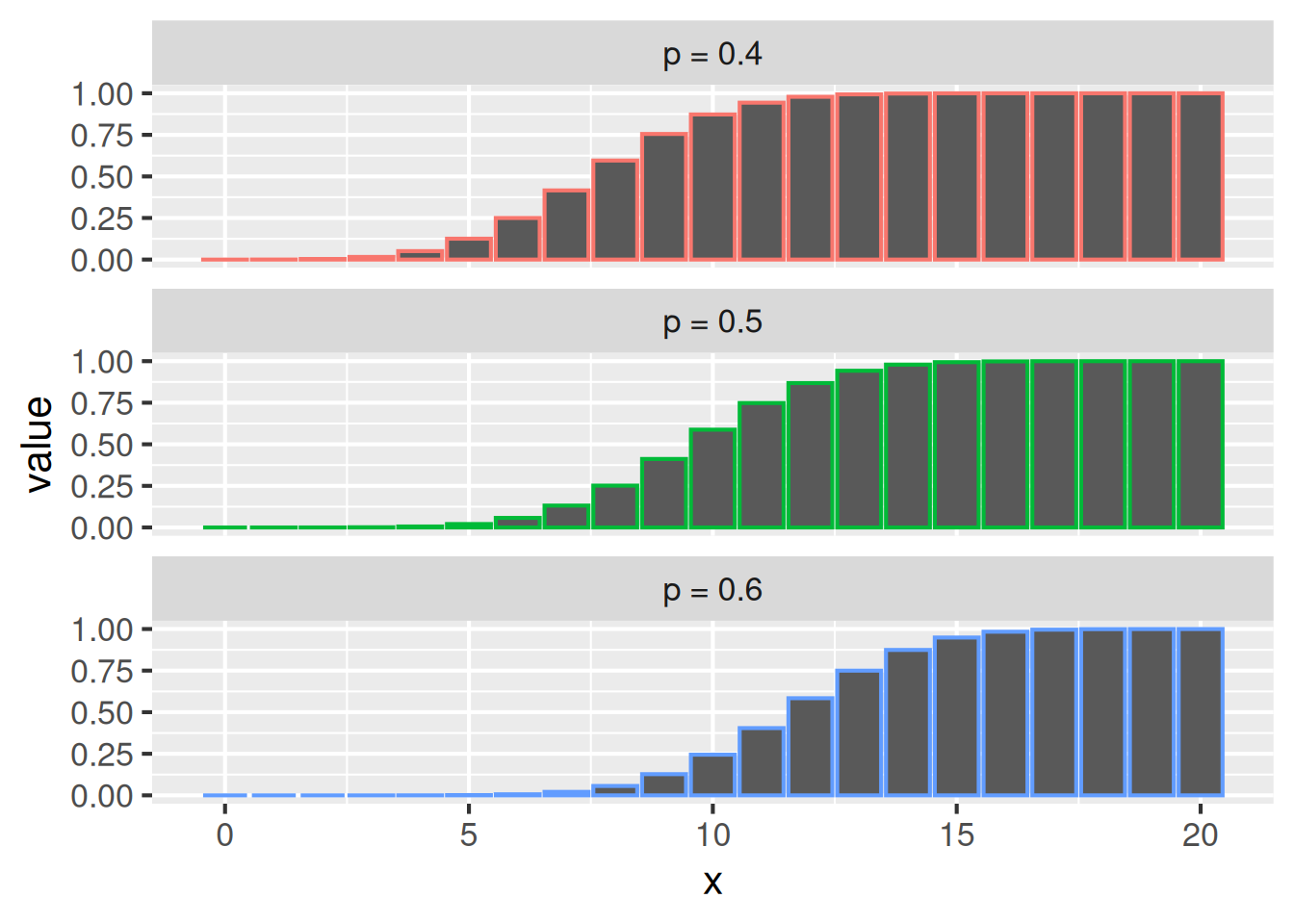 "p = 0.5" = pbinom(x, size = 20, prob = 0.5),