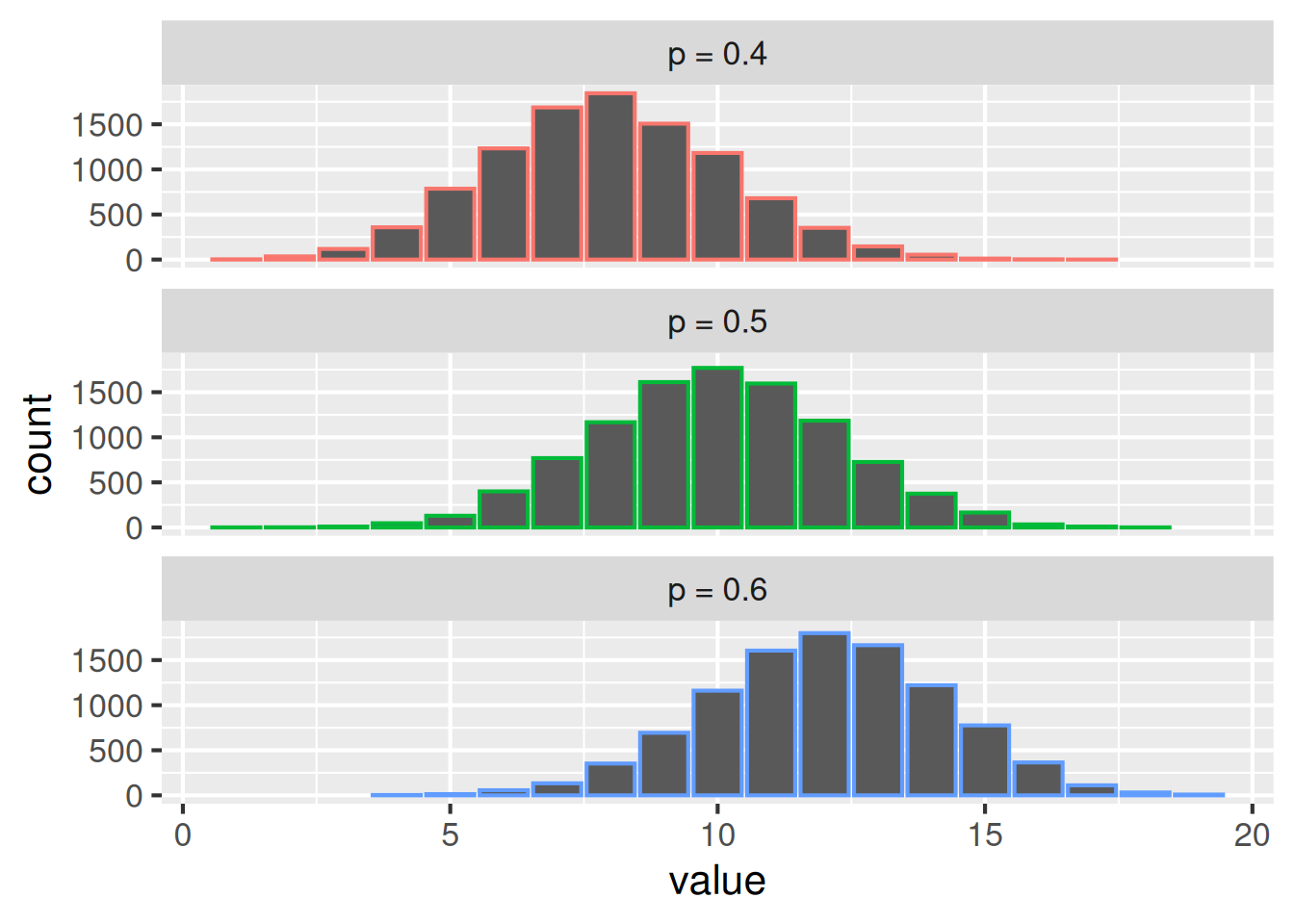 "p = 0.4" = rbinom(n, size = 20, prob = 0.4),